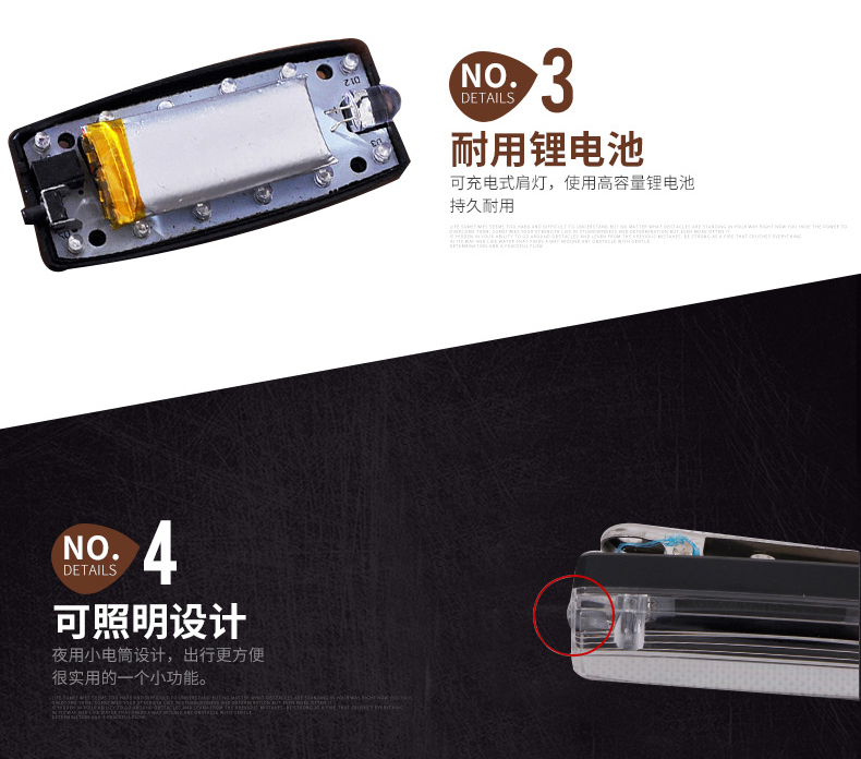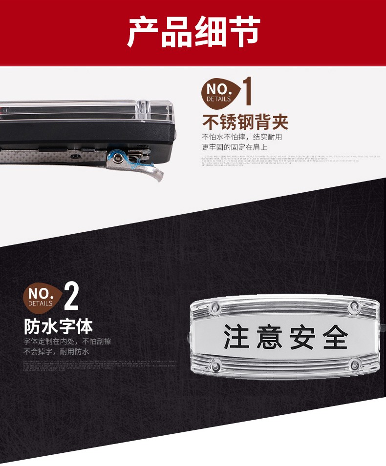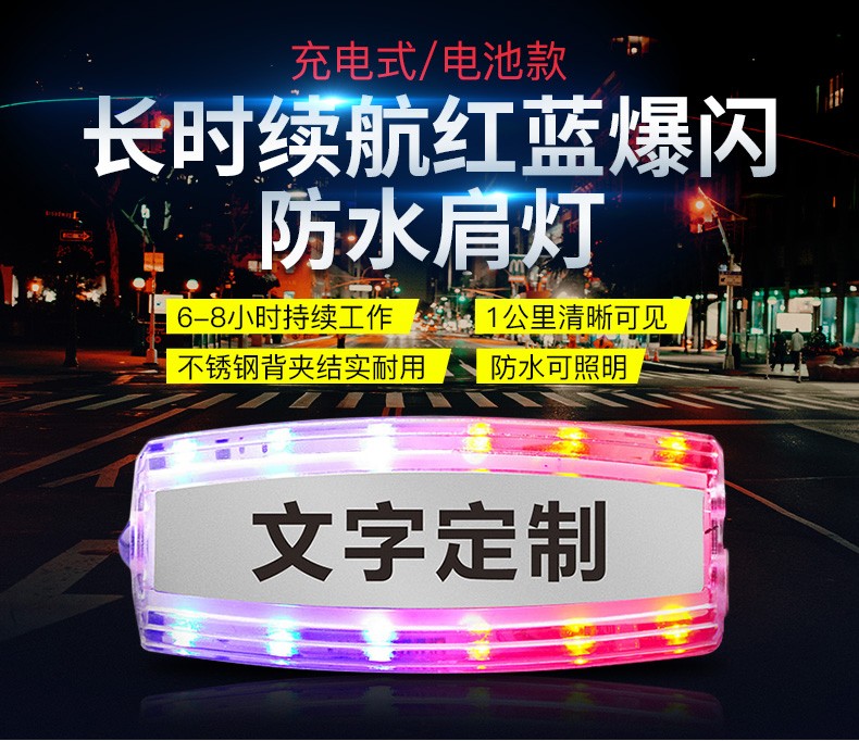 安全防護(hù)肩燈主要用于公路交通工作人員,道路環(huán)衛(wèi)工人以及行人夜間道路安全警示,通過多模式,高警示,自主LED發(fā)光提醒過往司機(jī)亮燈處有人員存在,小心駕駛,從而達(dá)到保護(hù)佩戴者的功能。曾經(jīng)有新聞報(bào)道,小小的肩燈給一個在火災(zāi)中的生命帶來生存的希望,如果沒有這個肩燈,那消防救助員就不容易發(fā)現(xiàn)他。相信小小的肩燈會實(shí)現(xiàn)越來越多,越來越大的功能,可以說肩燈在某些環(huán)境是保命的法寶。公司所生產(chǎn)的充電肩燈和電池肩燈都是通過LED自主多模式發(fā)光,實(shí)現(xiàn)爆閃,流水閃,頻閃等高警示閃光,起到非常好的警示效果。