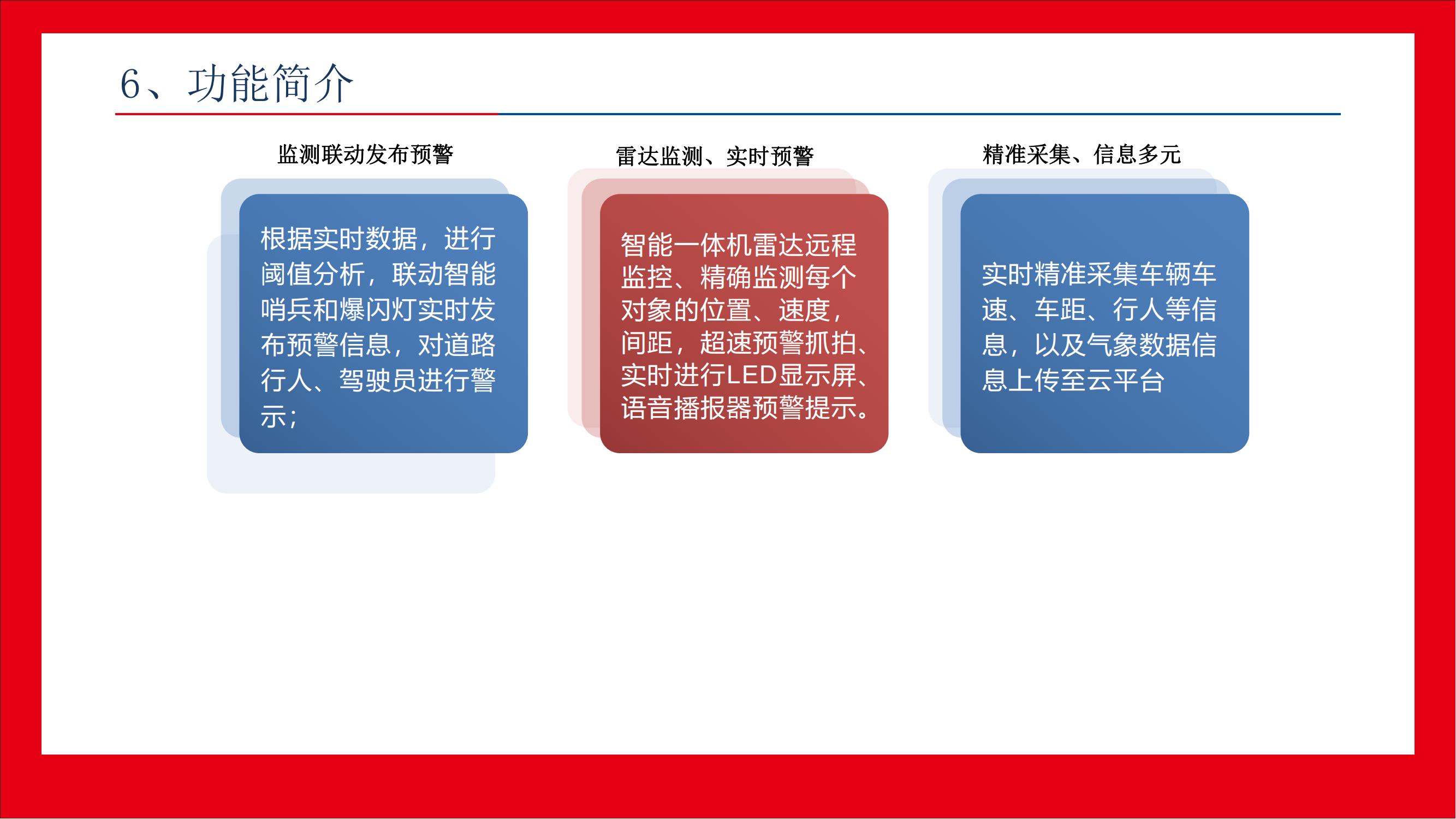 l 一體化設(shè)備:集雷達監(jiān)測、聲音預(yù)警(號角喇叭)、燈光預(yù)警(紅藍爆閃燈、速度顯示、文字顯示)、視頻取證等功能,對行車安全起到預(yù)警作用。